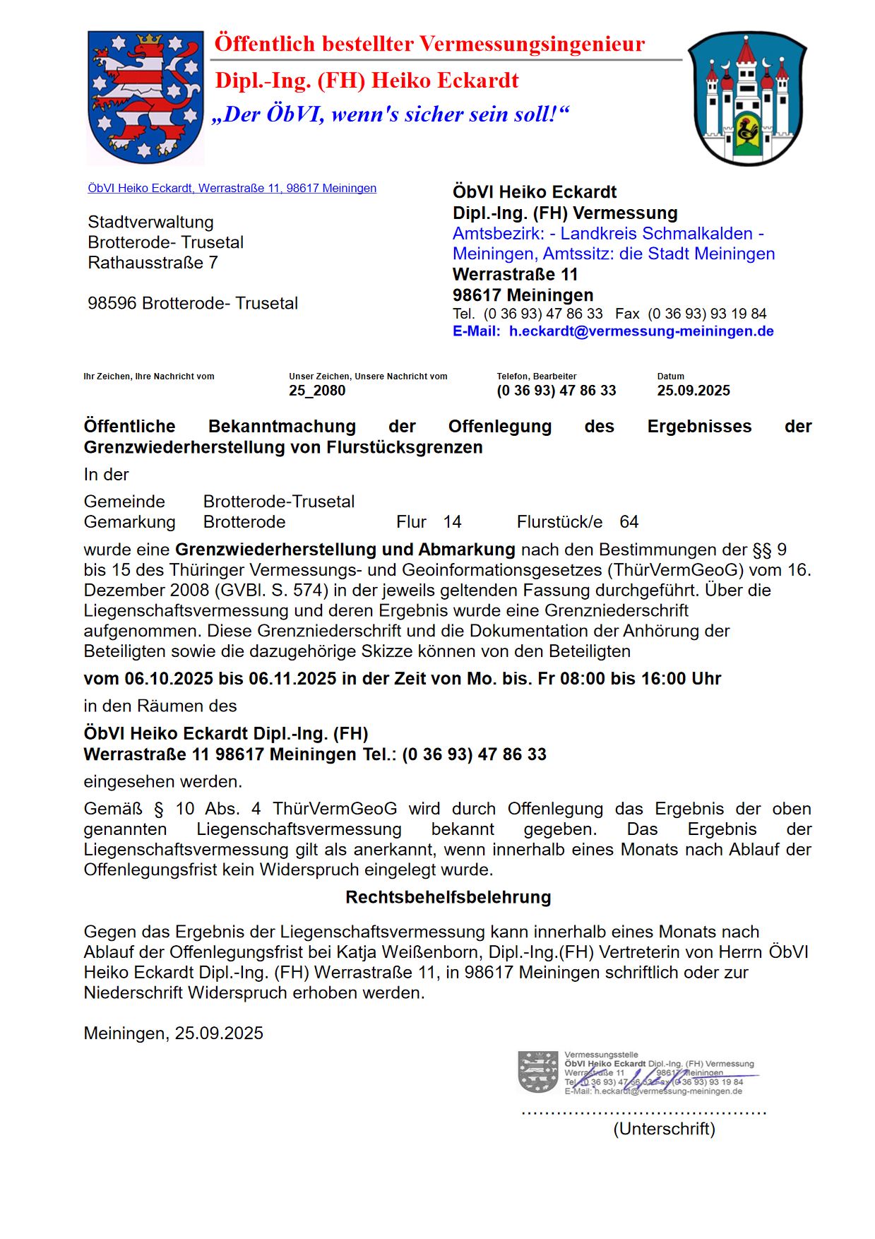 Bekanntgabe Brotterode Flur 14 Flurstück 64 von 6.10.2025 bis 6.11.2025.